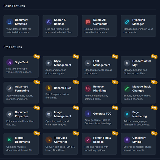 Transform your document workflow with BulkDocEditor Pro - the ultimate web-based tool for bulk Word document processing. Stop wasting hours on repetitive edits and automate your entire document management process with 20+ powerful features.